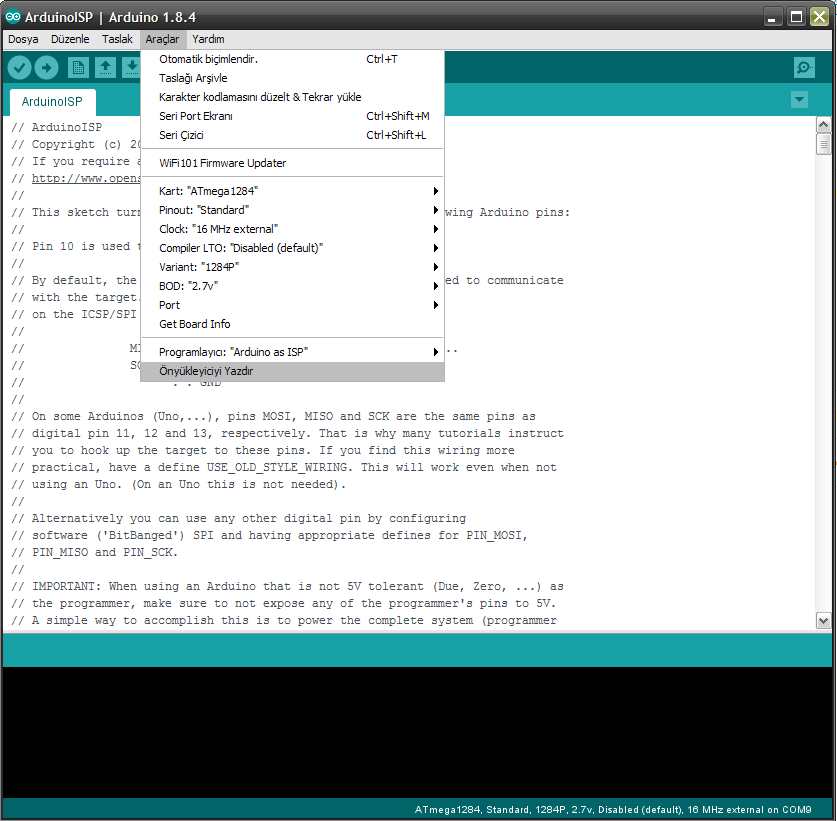 Araçlar menüsü altından kartı ATmega 1284 olarak seçip, yine aynı menü altındaki programlayıcı seçeneğini ise “Arduino as ISP” olarak değiştiriyoruz. Herşey aşağıdaki gibi görünüyor ise önyükleyiciyi yakmaya hazırız demektir. Bu aşamada önyükleyiciyi yazdır tuşuna basmak yeterli olacaktır.