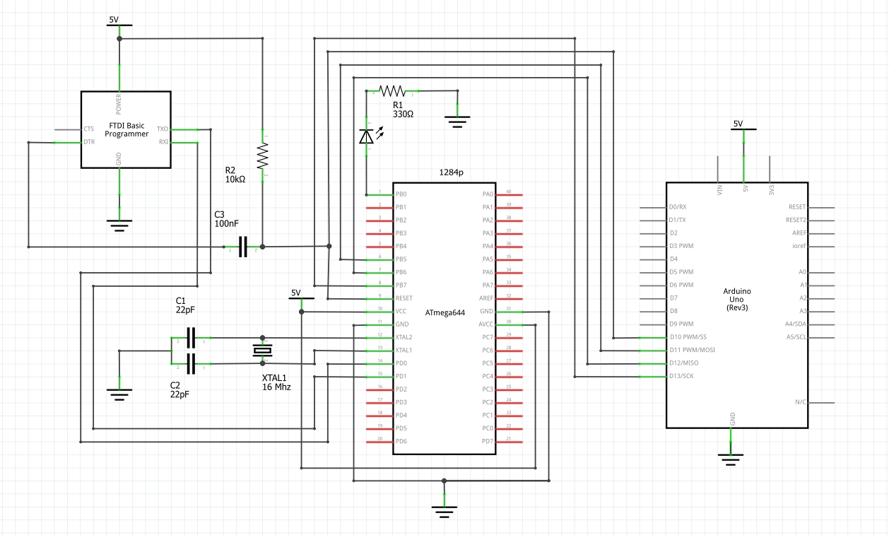 MightyCore kütüphanesini indirip arşivden çıkartıyoruz ve Belgelerim\Arduino\Hardware klasörünün içine kopyalıyoruz. Dosya menüsü altından Örnekler>ArduinoISP örneğini açıp ve bir Arduino UNO kartına yüklüyoruz. Daha sonra aşağıdaki şemada gösterilen devreyi breadboard üzerine kuruyoruz.
