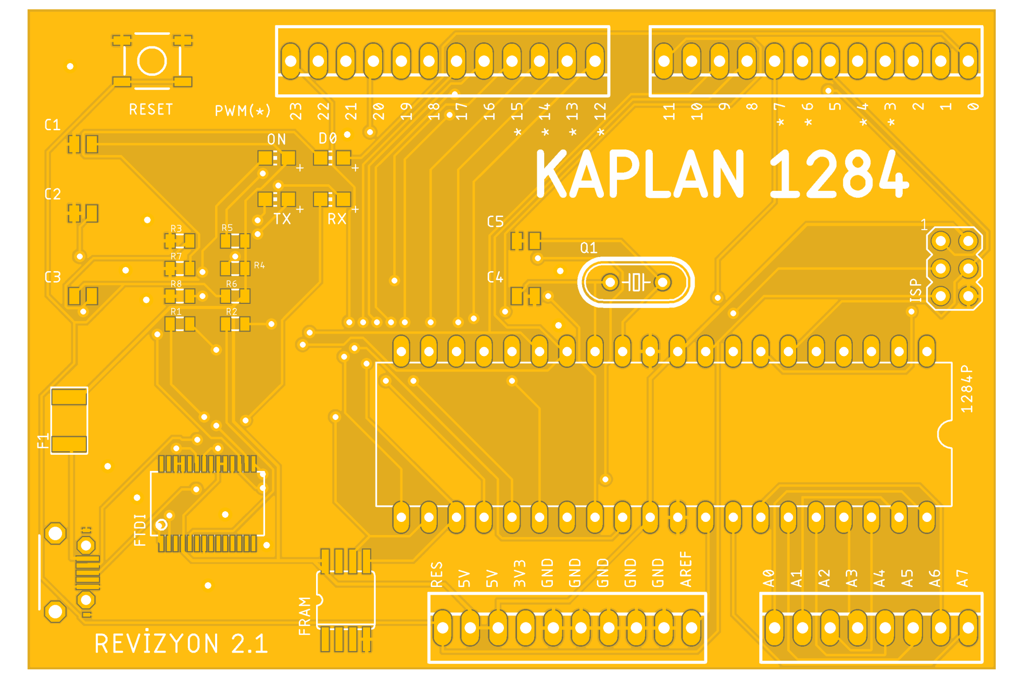 Kaplan 1284, PCB tasarımını Eagle programı ile yaptığım ve Çin’de üretilen Arduino uyumlu bir geliştirme kartı. Kart, ATMEGA 1284P, 2KB FRAM ve FTDI yongalarını içeriyor. SMD ve DIP bileşenlerin tamamı kalem havya ile lehimlendi.