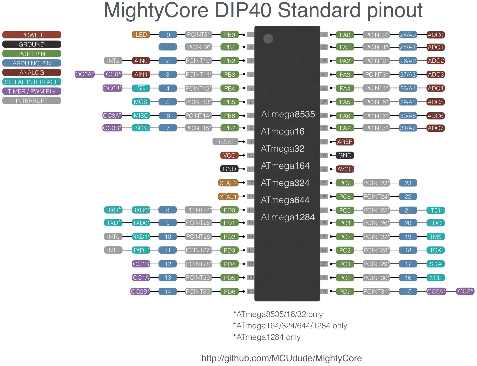 Önyükleyici yakma işlemini tamamlandıktan sonra programlayıcı olarak kullandığımız Arduino kartı ile işimiz bitiyor. Bir USB TTL dönüştürücü vasıtasıyla mikrodenetleyicimize doğrudan program yükleyebiliriz. Bu noktada FTDI kartı düşük maliyetli ve pratik yapısıyla işimizi fazlasıyla görecektir. Buraya kadar yaptıklarımızı blink kodunu yükleyerek test edebiliriz. Kodu yüklemeden önce programlayıcıyı tekrar “AVRISP mkII” olarak değiştirmeyi unutmayın. Mighty Core kütüphanesinin standart pin yapısını seçtiğimiz için normalde Arduino UNO’da 13. pine bağlı olan ledimiz burada 0. pine bağlı olacak. MightyCore standart pin yapısının Arduino pin karşılıklarını aşağıdaki şemada görebilirsiniz.